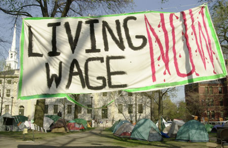 Twenty-five students exited Massachusetts Hall on May 8, 2001, to cheers and applause of two thousand people gathered outside. The students’ departure marked the end of a 21-day occupation of the university’s oldest extant building, within which is located the offices of Harvard’s president, The action was the culmination of a four-year campaign by Harvard’s Progressive Students Labor Movement (PSLM) to compel the university to pay its employees a living wage—one sufficient for workers to provide for their basic needs. At the time, a living wage in Cambridge was $10.25/hour, plus benefits; the federal minimum wage was $5.15. Harvard’s endowment was about $20 billion.